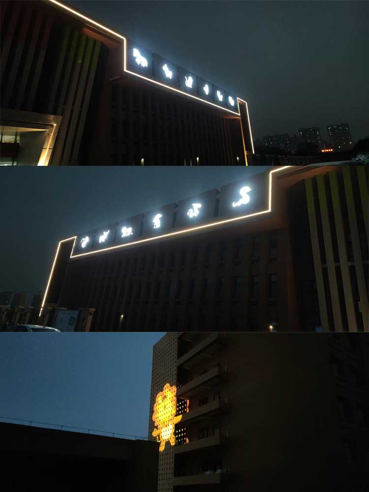 簡介—— 西安市兒童福利院亮化工程,主要是采用線條燈對樓體的頂部和側面輪廓進行勾勒,主樓安裝十二生肖發(fā)光造型,側墻采用圖案燈進行動畫投影,打出絢麗多彩的動畫卡通人物,與建筑的實用完整結合。